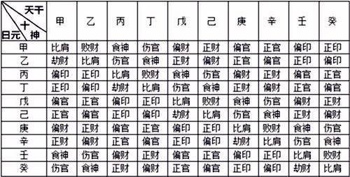 由于同类五行又有阴阳之分,相应地六亲也有偏正之别。因此克我、我克、生我、我生以及同我的六亲关系又分出十种称谓,此即八字命学之“十神”。请看下面六亲十神表。
