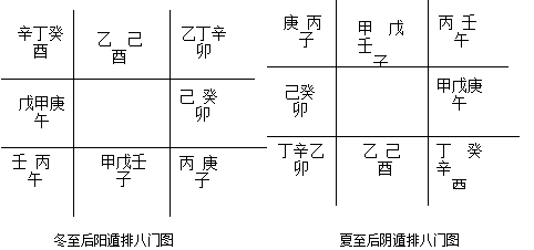 冬至后和夏至后排八门,可分别用下二图表示: