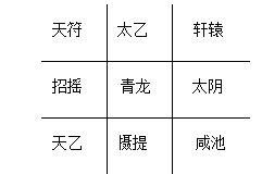 以冬至后阳遁乙丑日九星落局为例:离九宫起太乙,坎一宫摄提,坤二宫轩辕,震三宫招摇,巽四宫天符,中五宫青龙,乾六宫减池,兑七宫太阴,艮八宫天乙,如下图: