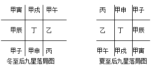九星落局也按冬至后阳遁、夏至后阴遁进行,一日一宫而行。阳遁按八、九、一、二、三、四、五、六、七的次序给各宫配入九星;阴遁按二、一、九、八、七、六、五、四、三的宫次配入九星。