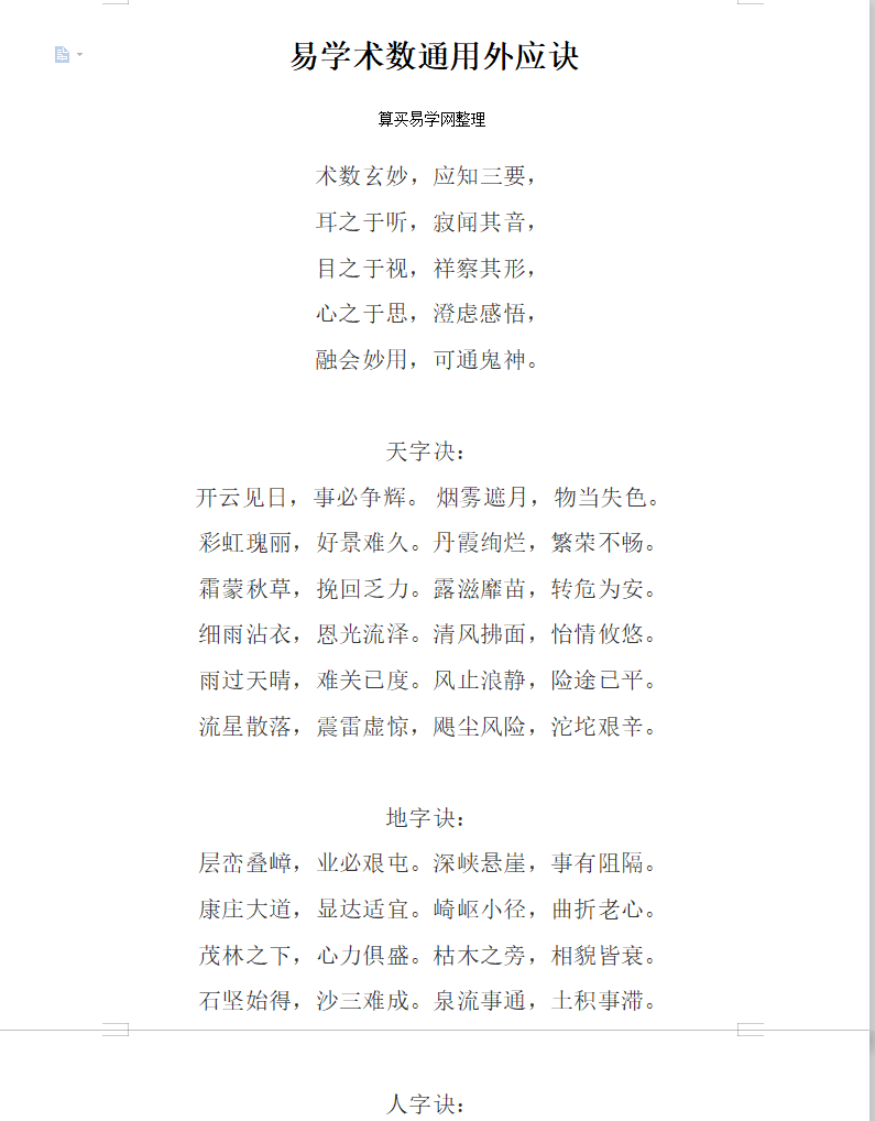 这套外应口诀不光能用在奇门遁甲中,在任何术数里都能用到,包括梅花易数、六爻纳甲、大六壬等、甚至八字中也可以用到的一套实用而又全面的外应口诀。喜欢的朋友可以下载