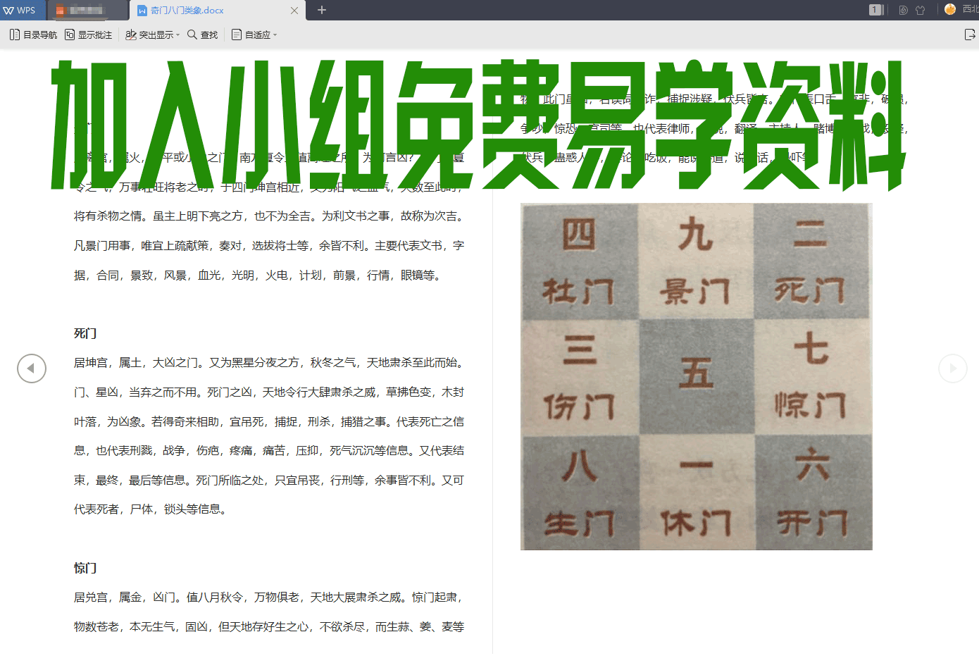 居震宫,属木,凶门。正值春分之时,嫩甲发生,当以吉看,何以凶论?伤门之木正值春分之气,精华自内而出,发阳于外,以致根本泄之太过,故外华而内虚,而不能胜其旁。又二月中嫩甲不能抵御霜露之寒,因而谓之伤,故凶矣。通常代表伤灾,疾病,跑动,响声,伤害,残疾,车辆,船只,打斗,战争,赌博等。所临之宫,不利经商、出行、婚嫁,只宜所债,狩猎,捕捉盗贼,赌博取胜等。
